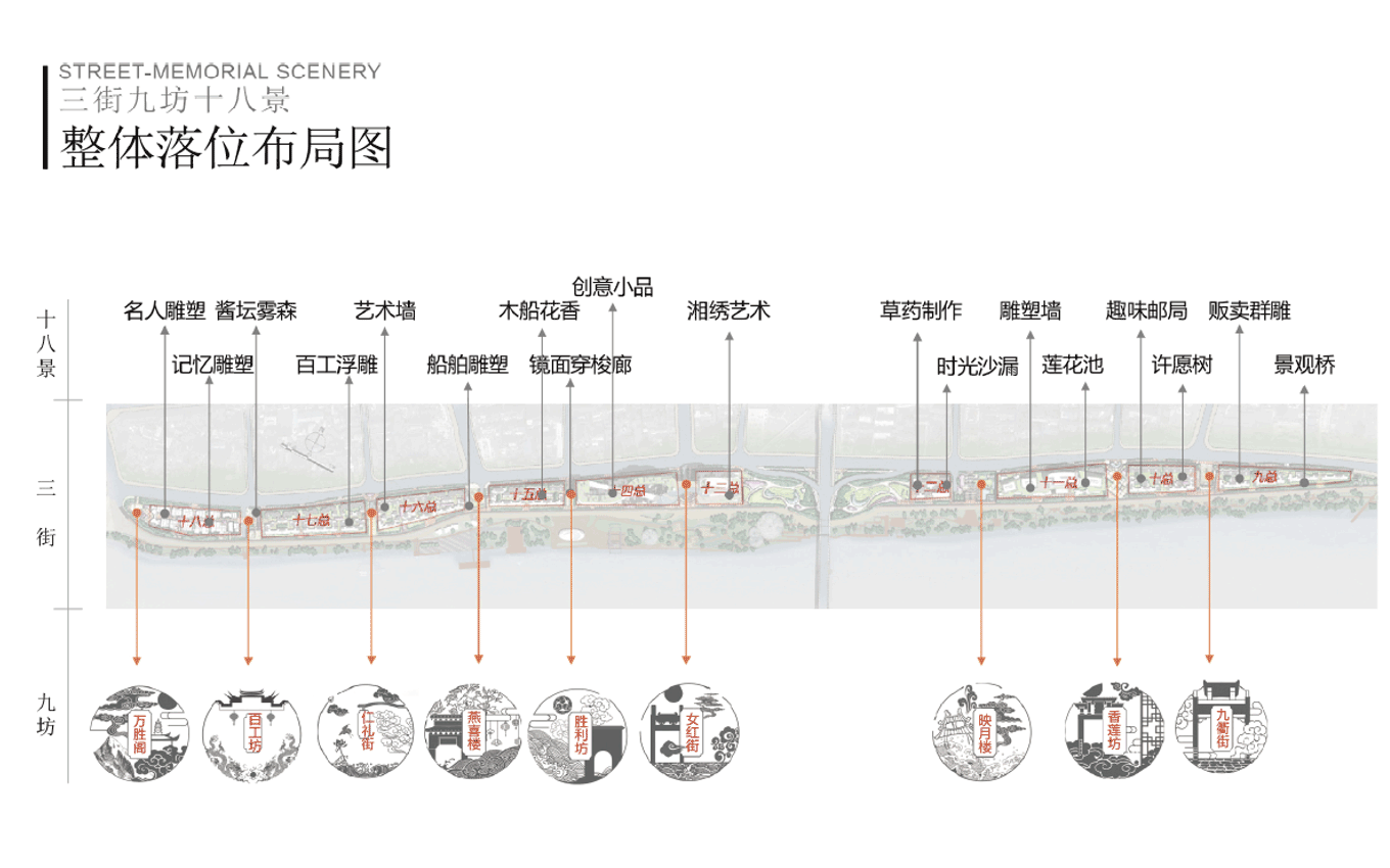 三街九坊十八景標識系統(tǒng)規(guī)劃設計,十八景是服務于老街業(yè)態(tài)的文化亮點,是以烘托繁榮商貿(mào)氛圍、高度還原文獻記載、展現(xiàn)當?shù)孛袼孜幕⑿纬赏暾囊粭l具有歷史文化的老街故事。